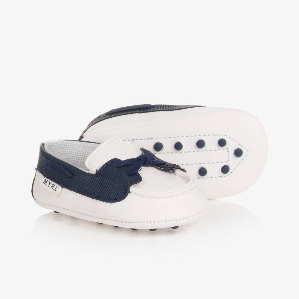 Traditional ivory pre-walker moccasins for baby boys from Mayoral. Made in sturdy faux leather, they are lined with textile for added comfort and the outer soles have classic rubber pebble studs. They have navy blue trimming and a knot detail on the front for a stylish finish.
