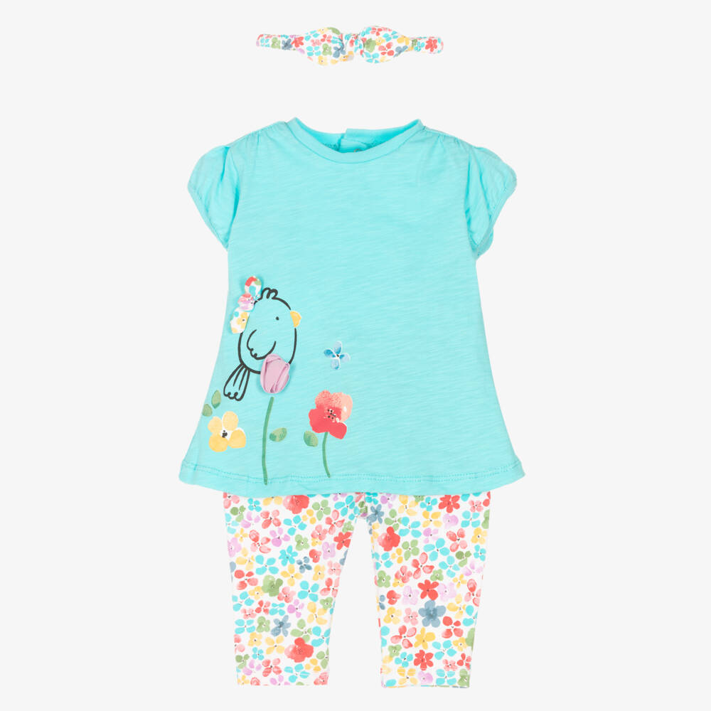 Aqua blue leggings set for baby girls from Mayoral, made in soft cotton jersey. The blue top has a chirpy bird print on the front, with colourful flowers and a 3D lilac purple appliqué. It comes with ivory leggings and a headband, both bearing a colourful floral pattern, for a fully co-ordinated outfit.