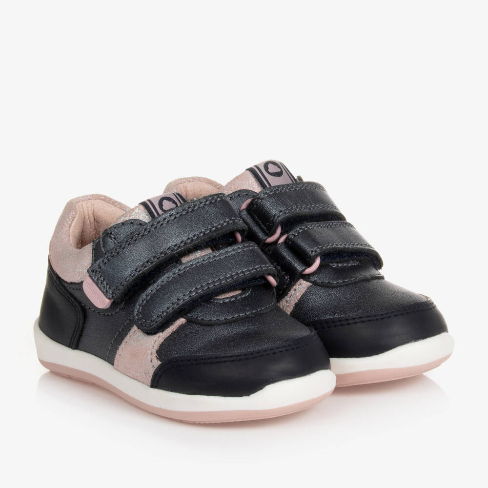 Navy blue and pink leather first walker trainers from Mayoral, with glittery pink trims for a lovely touch of sparkle. Fully lined with soft leather, they have lightly cushioned insoles and padded ankles for comfort and support. They fasten securely with velcro straps and have flexible, non-slip rubber outer soles for a secure grip underfoot when taking those first steps.