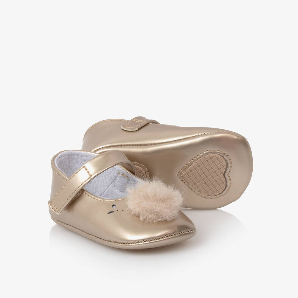 Super sweet, these pale gold pre-walker shoes for baby girls are by Mayoral. Made from shiny faux patent leather, they are decorated with fluffy tonal pom-poms and perforated detailing on the toes. They are lined in soft cotton jersey for comfort and have flexible faux leather outsoles with non-slip rubber panels for better grip.
