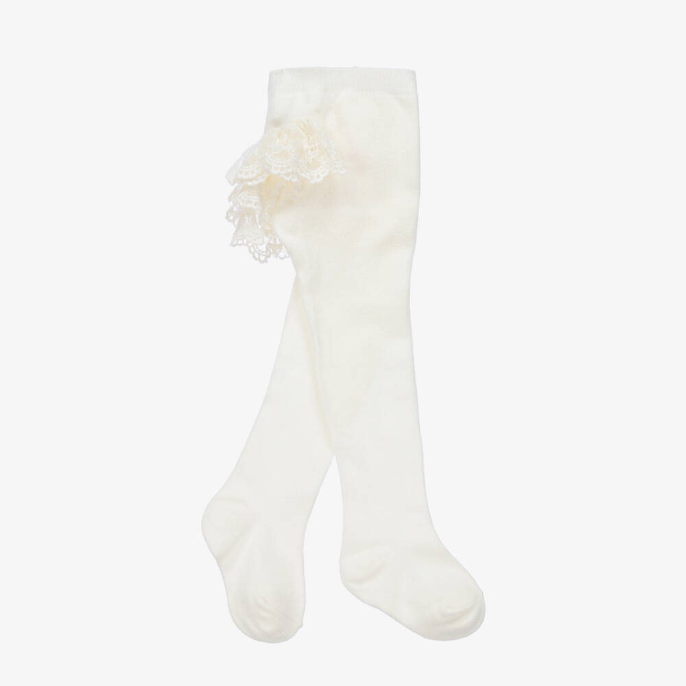 A pair of ivory tights for baby girls by Mayoral, knitted in a soft and stretchy cotton blend. They have an elasticated waistband for comfort and decorative lace ruffles on the back for a pretty finish.