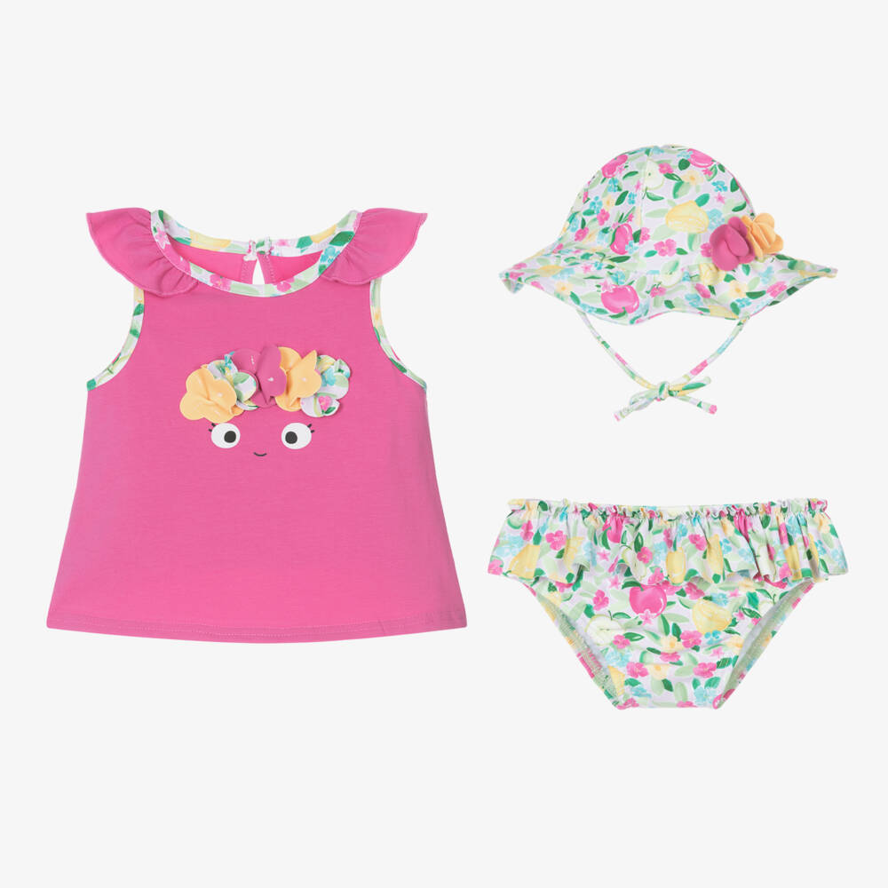 Adorable pink beach set for baby girls by Mayoral. Made from soft cotton-blend jersey, the sleeveless top has a fun face design on the chest with fabric flowers stitched above. It has a keyhole button fastening on the back for a neat finish. Soft and smooth, the ruffled elasticated bikini bottoms are printed with a lovely floral fruit pattern, featuring lemons and apples. The coordinating hat has 3D flower embellishments on the front and ties that secure neatly under the chin.