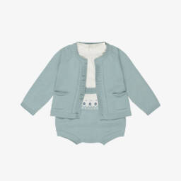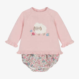 Sweet pink shorts set for baby girls by Spanish brand Mayoral, made in comfortable cotton. The long-sleeved, knitted sweater has an adorable, fluffy sheep intarsia on the front, with embroidered flowers. Soft and lightweight, it has frilly, ribbed trims and fastens with buttons on the back. The pretty floral bloomer shorts have a deep frill on the sides and back, with a gently elasticated waistband and cuffs. They are fully lined for comfort. A pair of pink tights completes the set.
