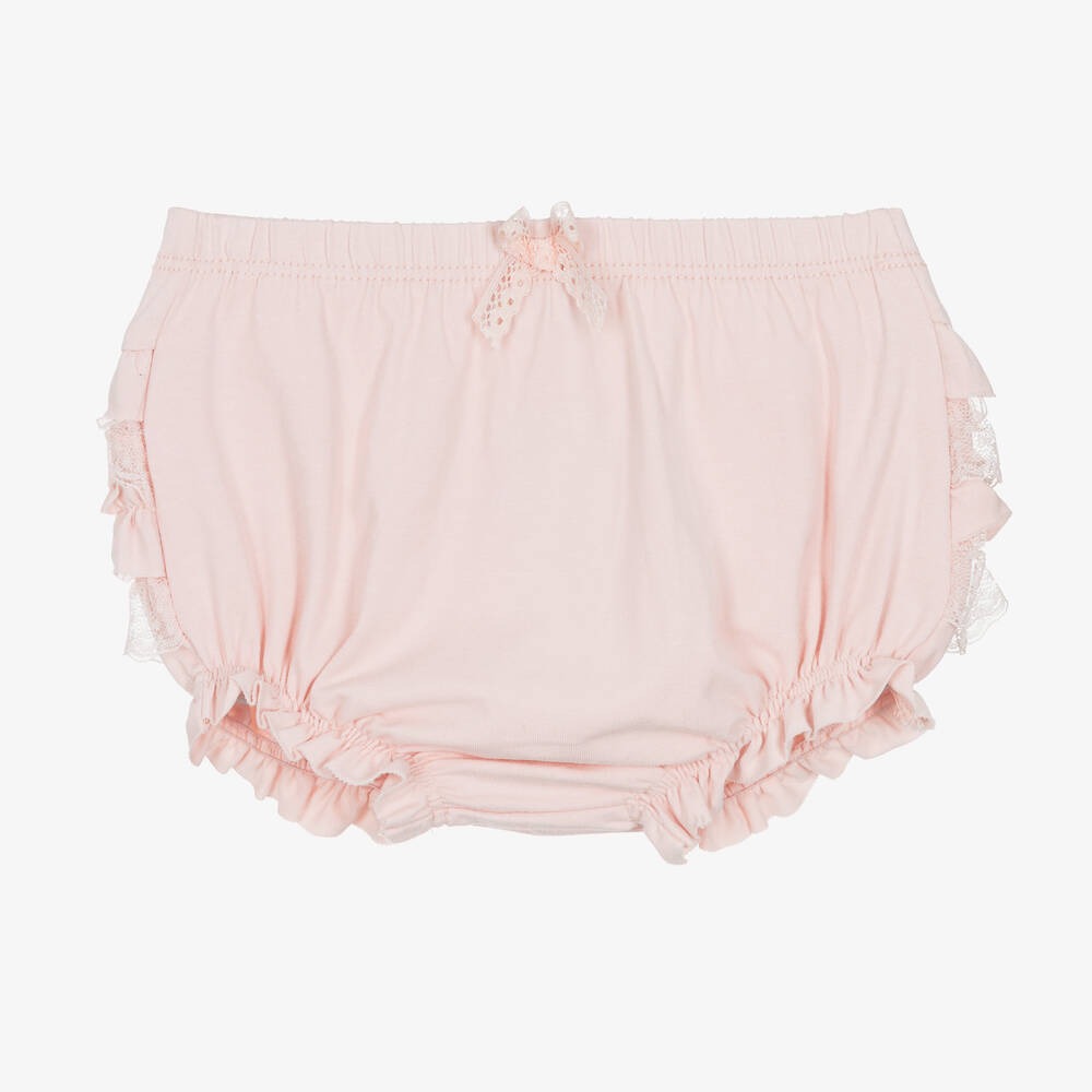 Pretty pale pink frilly pants for baby girls by Mayoral, made in soft and comfortable cotton jersey. Gently elasticated on the waistband and leg openings for a comfortable fit, they have a sweet lace bow on the front and layers of frilled jersey and lace on the back.