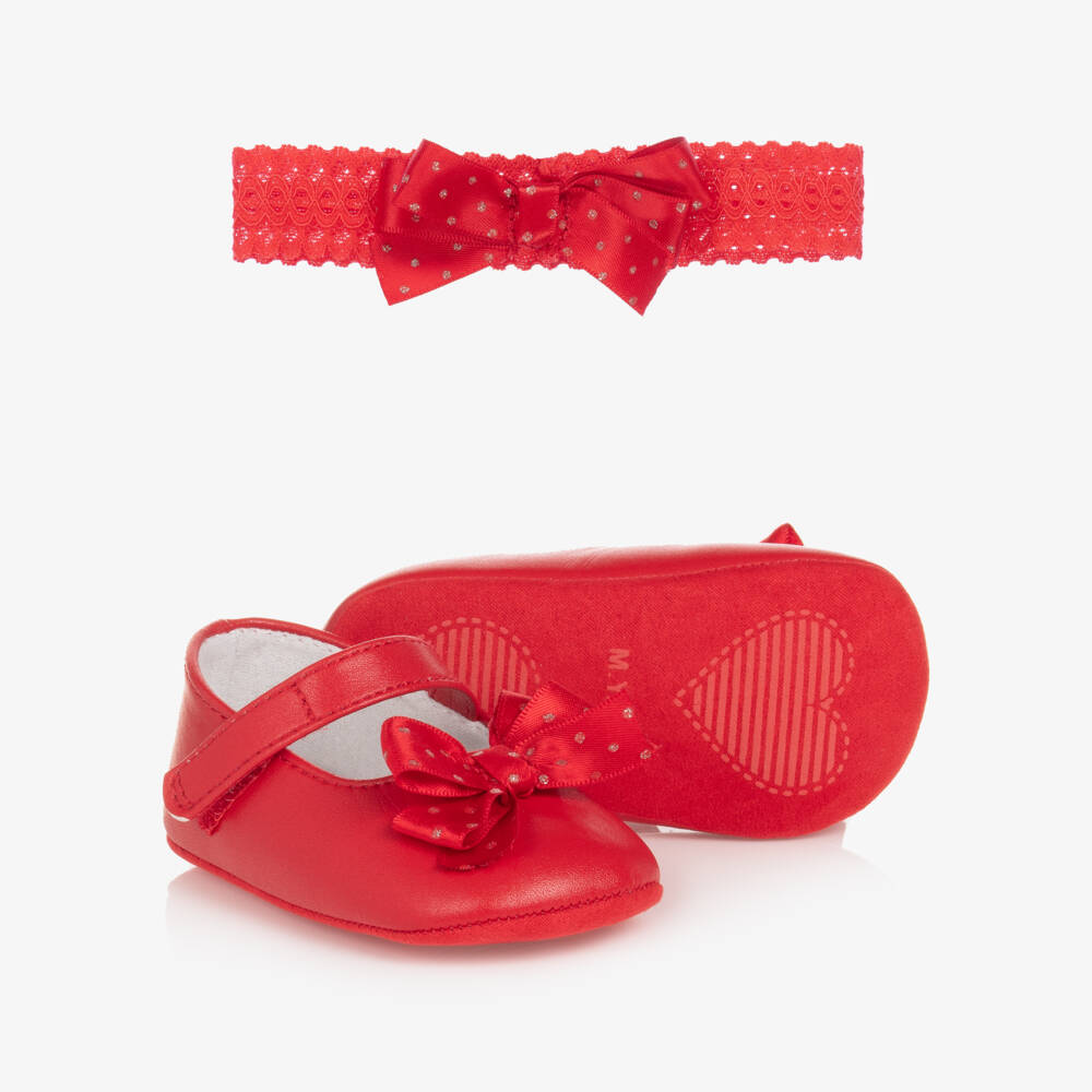 Lovely red pre-walker shoes set for baby girls from Mayoral. Made in faux leather, they are sturdy yet flexible and have faux suede outer soles. The foot strap fastens with velcro for a comfortable and secure fit and they have glittery grosgrain ribbon bows on the front for a pretty finish. To complete the look, they come with a matching stretchy lace headband.