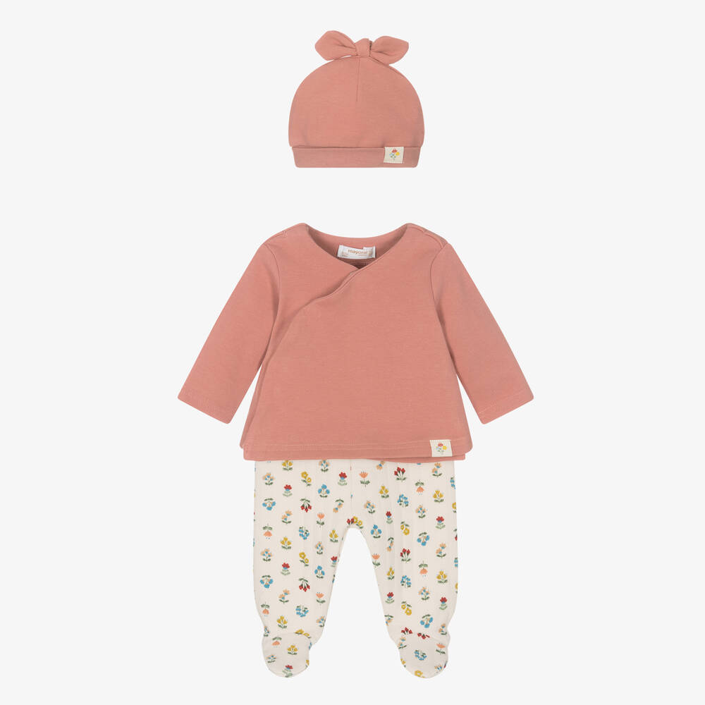 Cute two piece babygrow and hat set for girls by Mayoral, made in comfortable cotton jersey. The terracotta red top fastens on the sides with concealed poppers and has a floral tab on the hemline. The ivory lower part has a pretty floral pattern and a comfortable fold-over, ribbed waistband. The babysuit comes with a coordinating hat with a sweet top knot and a ribbed brim.