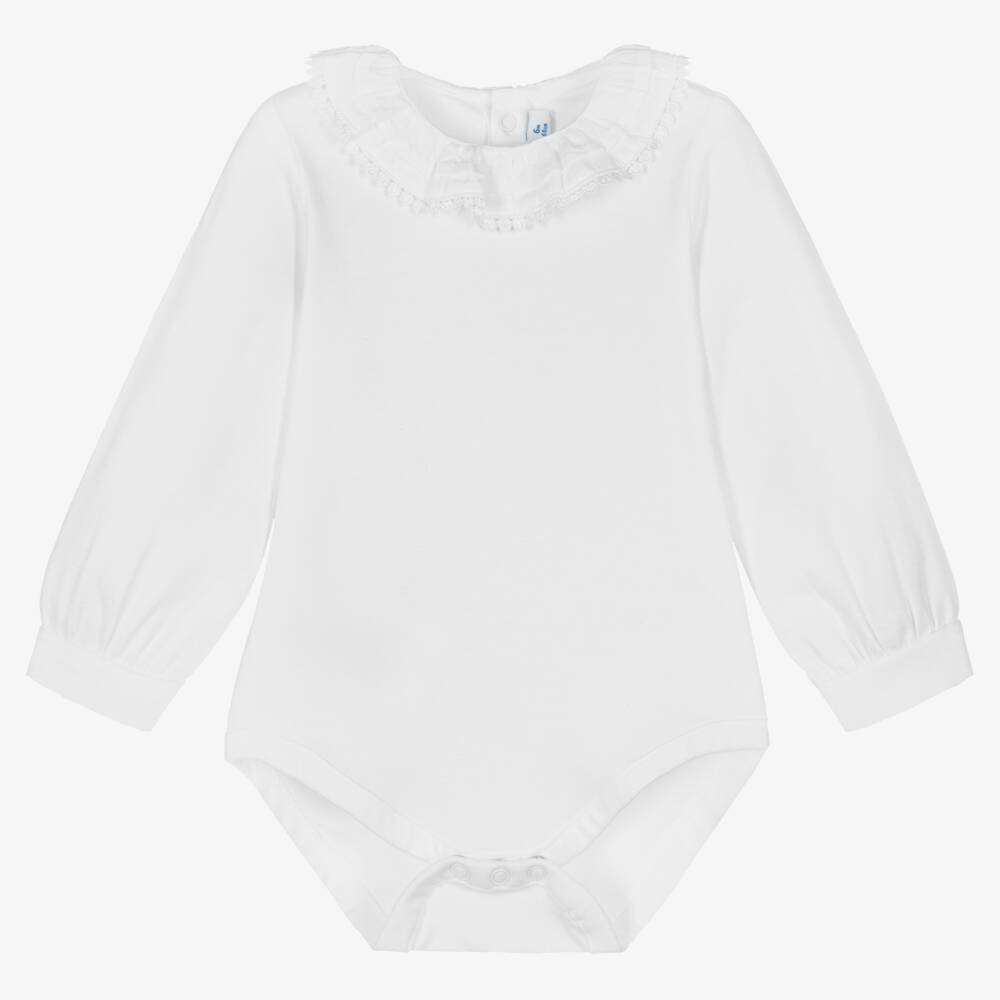 A delightful white cotton bodysuit for baby girls by Mayoral, made in comfortable, stretchy jersey. It has a frilled, tiered collar with a pretty, heart-shaped, embroidered trim. There are popper fastenings on the back and between the legs, so it always stays neatly tucked in.
