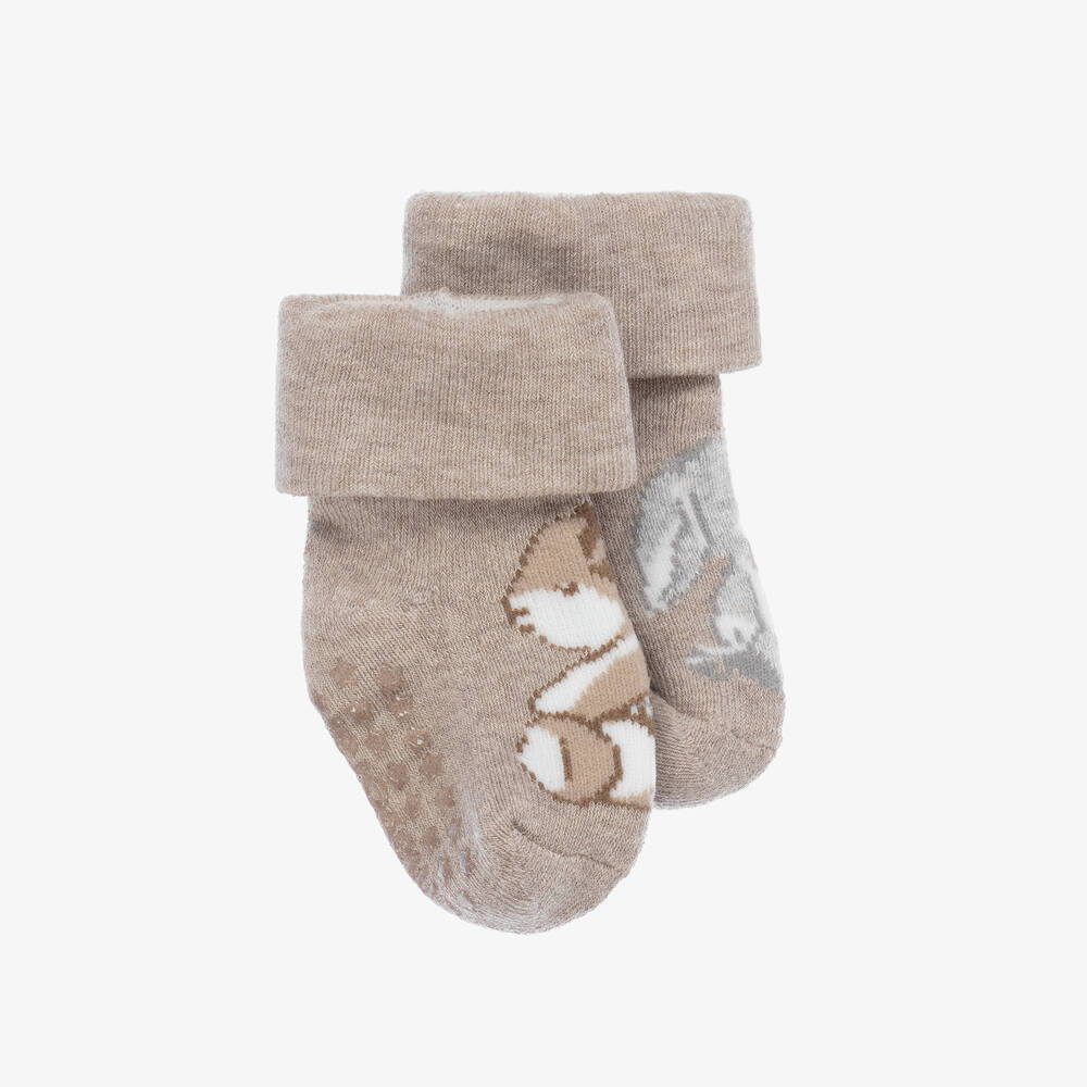 Super cute beige socks for baby boys and girls by Spanish brand Mayoral, with sweet intarsia bunnies on the front. Warm and cosy, they are made in a mid-weight cotton blend, with a fleecy inside. They are ankle length, with roll-over cuffs and useful, non-slip soles.