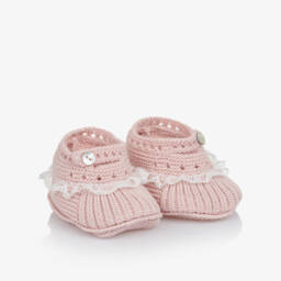 Adorable beige booties for baby boys and girls by Mayoral, in a soft cotton knit. This sweet T-bar style has a diamond cable pattern on the front and is fastened with a button on the side.