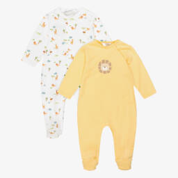 An adorable two-pack of yellow and white babygrows for boys and girls by Mayoral, made in comfortable cotton jersey. One is printed all over with sweet jungle animal designs. The other is plain and features a single lion motif on the front. Both babysuits fasten with poppers for easy dressing.