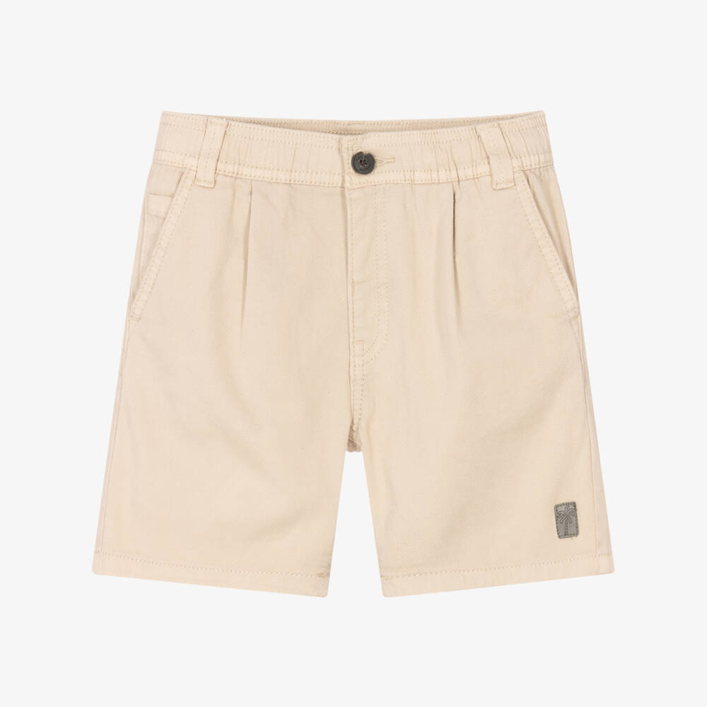 Beige sustainable cotton Bermuda length shorts for boys by Spanish brand Mayoral. Slightly stretchy with a textured feel, they have a comfortable, elasticated waist that fastens with a faux bone button, matching the buttons on the back pockets. There are useful jetted pockets with a coin pocket on the front and a faux leather palm tree badge on one leg.