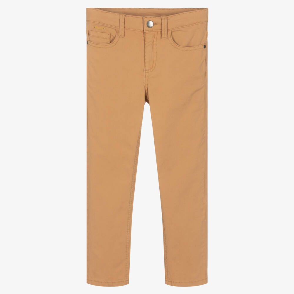 Casual beige slim-fit trousers for boys by Mayoral, made in sustainable cotton twill with a slight stretch for comfort. They have five-pocket styling with logo tabs on the front and back, and branded metalware. The waistband is adjustable for a great fit and they fasten with a zip and popper.