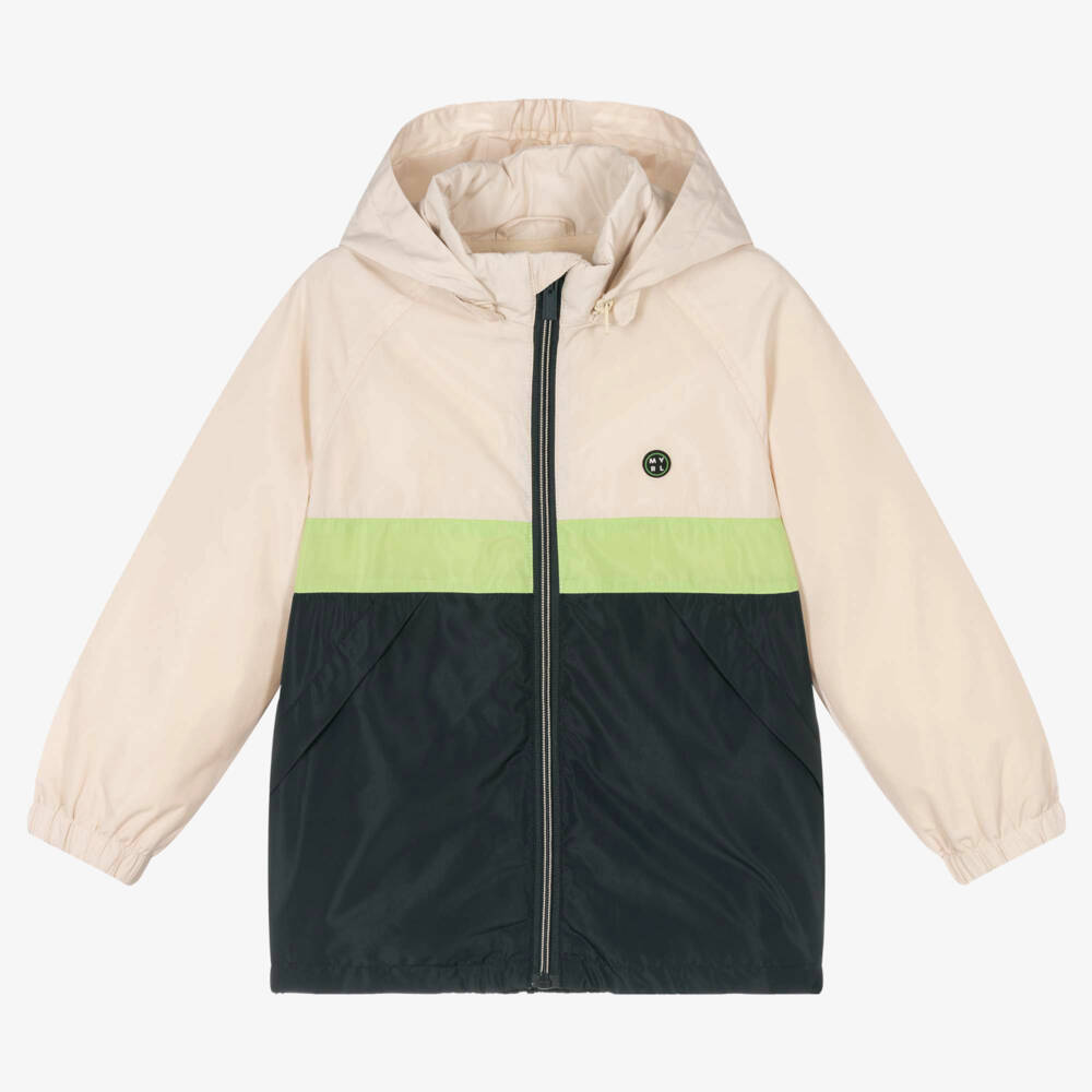 Boys beige and dark grey colourblock windbreaker by Mayoral, made in silky smooth fabric. Fastening with a zip, it has a detachable hood, allowing for two different looks. There is a green strip around the middle and a small black rubber logo on the chest. The soft jersey lining ensures this jacket still remains comfortable for your little one.