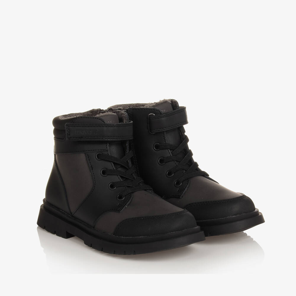 Black leather boots for boys by Mayoral with a cosy fleece lining, ideal for those colder days. These practical boots have elasticated laces, a side zip fastening and a velcro strap around the ankle to ensure a comfortable fit. A logo badge on the tongue adds designer appeal and the chunky, non-slip rubber outer soles provide a secure grip.