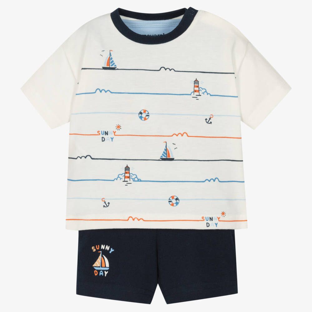 Nautical cotton three-piece shorts set for little boys by Spanish brand Mayoral, made in comfortable jersey. The ivory T-shirt is striped on the front, with sailing boats, lighthouses, anchors and the words 'sunny day'. It has useful popper fastenings on one shoulder. The pale blue vest top has a coordinating print. Designed for comfort, the navy blue shorts have a stretchy drawstring waistband, concealed front pockets and a matching print on one side.