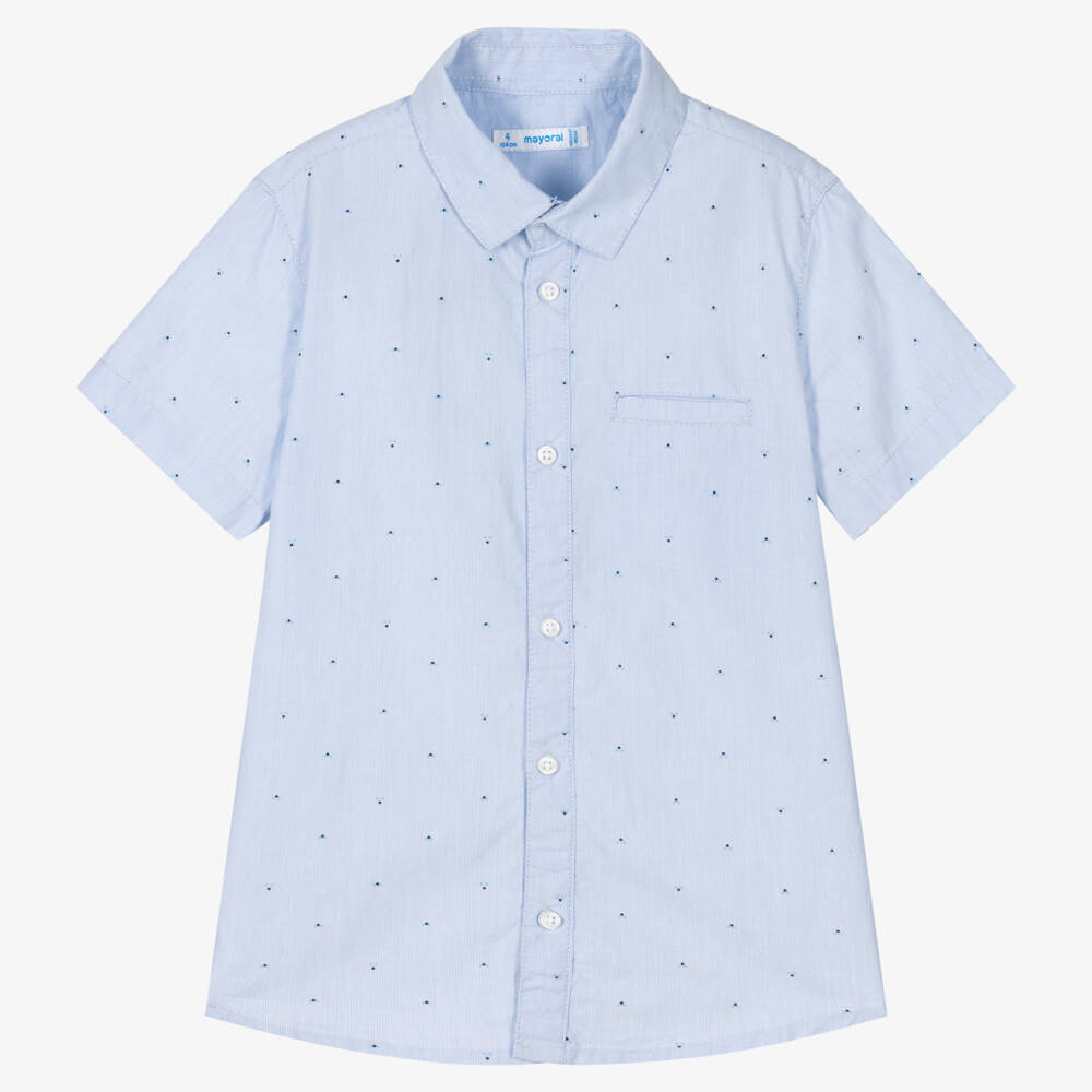 Smart casual blue sustainable cotton shirt for boys by Mayoral, fastening easily with front buttons. Ideal for warmer days, this lightweight shirt has a fine striped design and a tonal blue dotted pattern.