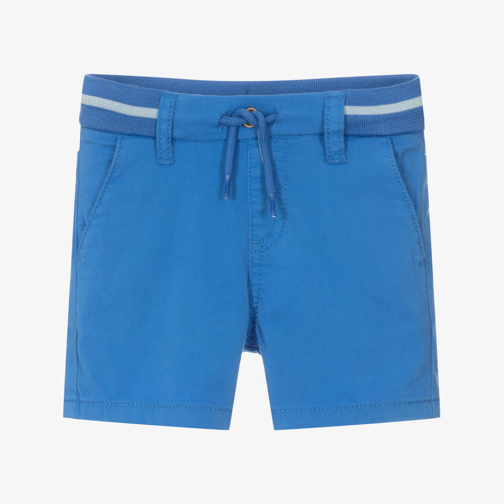 Cobalt blue shorts for little boys by Mayoral, made in a soft cotton blend. Ideal for pairing with T-shirts, these casual shorts have slanted hip pockets and a decorative wood-effect button on the front. The stretchy, knitted waistband is trimmed with a light blue stripe and can be easily adjusted with drawstring ties.