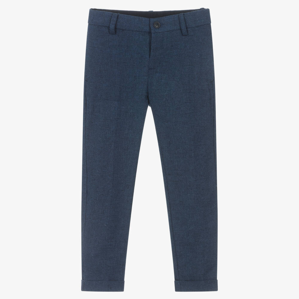 Blue trousers for boys by Mayoral, woven in a soft cotton and linen blend. These smartly tailored trousers have a comfortable adjustable waistband and fasten with a button on the front. They have useful side and back pockets, and the turn up hems add a stylish finishing touch.