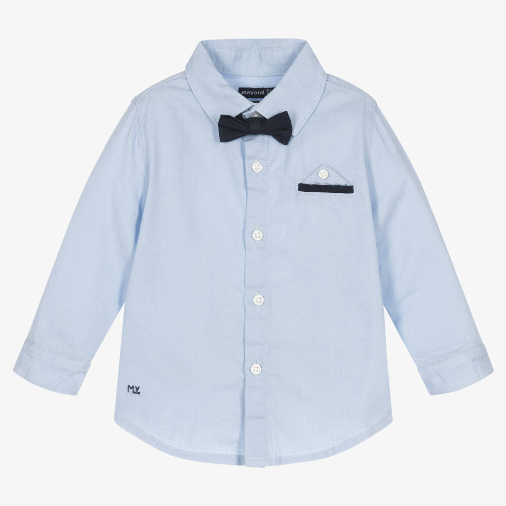 Smart blue sustainable cotton shirt for little boys by Spanish brand Mayoral, with a slight texture within the weave. It has an embroidered navy blue logo by the hemline and a navy blue trim on the faux chest pocket. Fastening with buttons on the front and cuffs, it comes with an adjustable navy blue bow tie.
