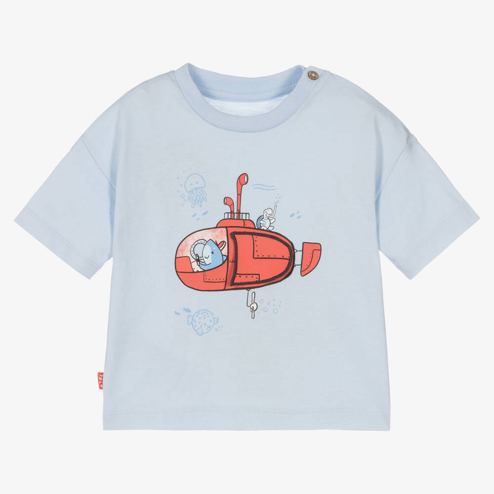 Pale blue cotton T-shirt for little boys by Mayoral. It has a red submarine printed on the front with a lift-up door showing all the animal passengers inside. Ideal for all-day relaxing, it is made in comfortable jersey and has a button with easy-to-use poppers on one shoulder.
