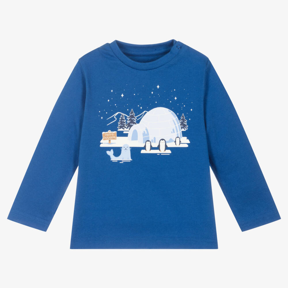 Royal blue top for little boys by Mayoral, with a fun glow-in-the dark penguin and seal print on the front. Soft and comfortable, it is made from sustainable cotton jersey and has popper fastenings on one shoulder.