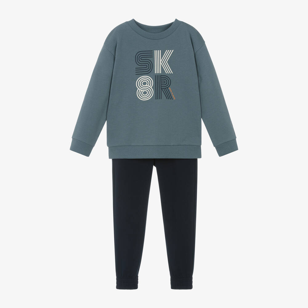 Blue tracksuit for boys by Mayoral, made in soft cotton-blend jersey. The blue-grey sweatshirt has a cool blue and white 'SK8R' graphic on the front and cosy ribbed trims. The navy blue joggers have extra durable knees, front and back pockets and a useful drawstring waist for a comfortable fit.