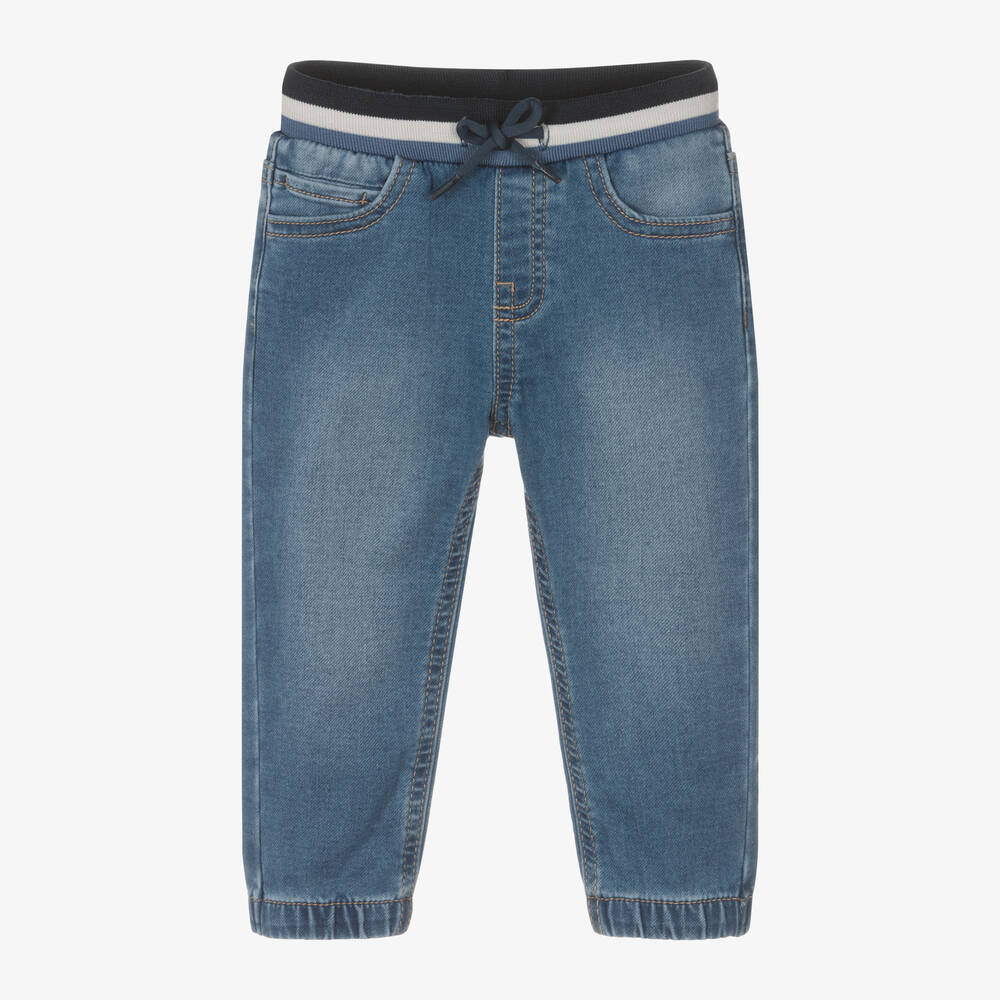 Stone wash-effect blue jeans for little boys by Mayoral, made in soft, stretchy cotton-mix jersey. Designed to look like denim jeans, these comfortable trousers have a jogger-style waist striped in tones of blue and adjustable with drawstrings. They have five convenient pockets, classic beige stitching, and elasticated cuffs.
