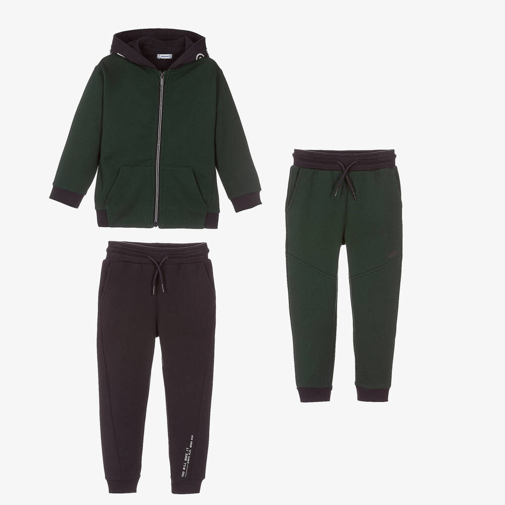 Boys dark green and navy blue three-piece tracksuit set from Mayoral. Printed with cool slogans on the pieces, the set is made in soft, mid-weight jersey with a fleecy underside. The zip-up top has patch pockets on the front and 'Cool Mood' printed in ivory across the navy blue hood. One pair of joggers are in plain navy blue and the other is dark green with navy blue trims. Both pairs have ribbed cuffs, drawstring waistbands, extra durable knees and pockets.