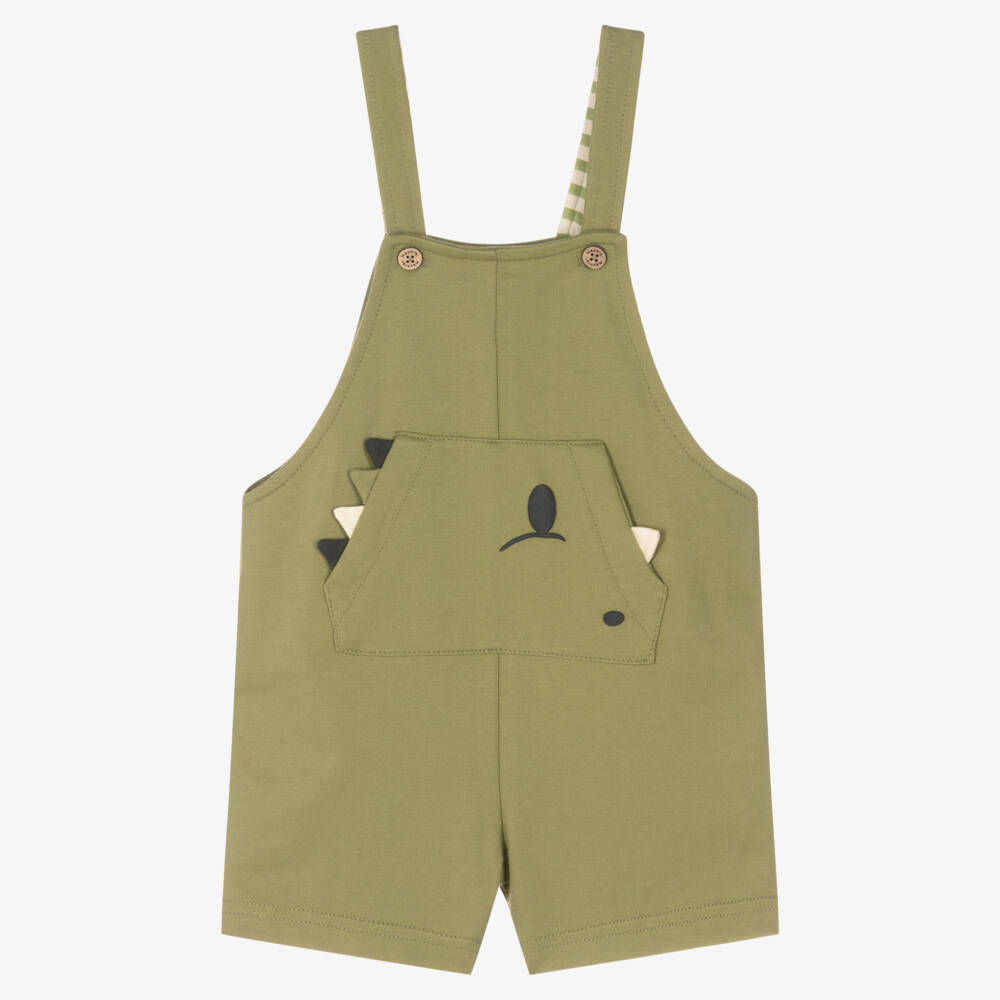 Khaki green dungarees for little boys by Spanish brand Mayoral, made in the softest cotton-blend jersey. They have fun dinosaur features on the pouch pocket, with adjustable shoulder straps that fasten with wooden buttons on the front. There is a black 'Hello Mr Dino' patch and a striped pocket on the back.