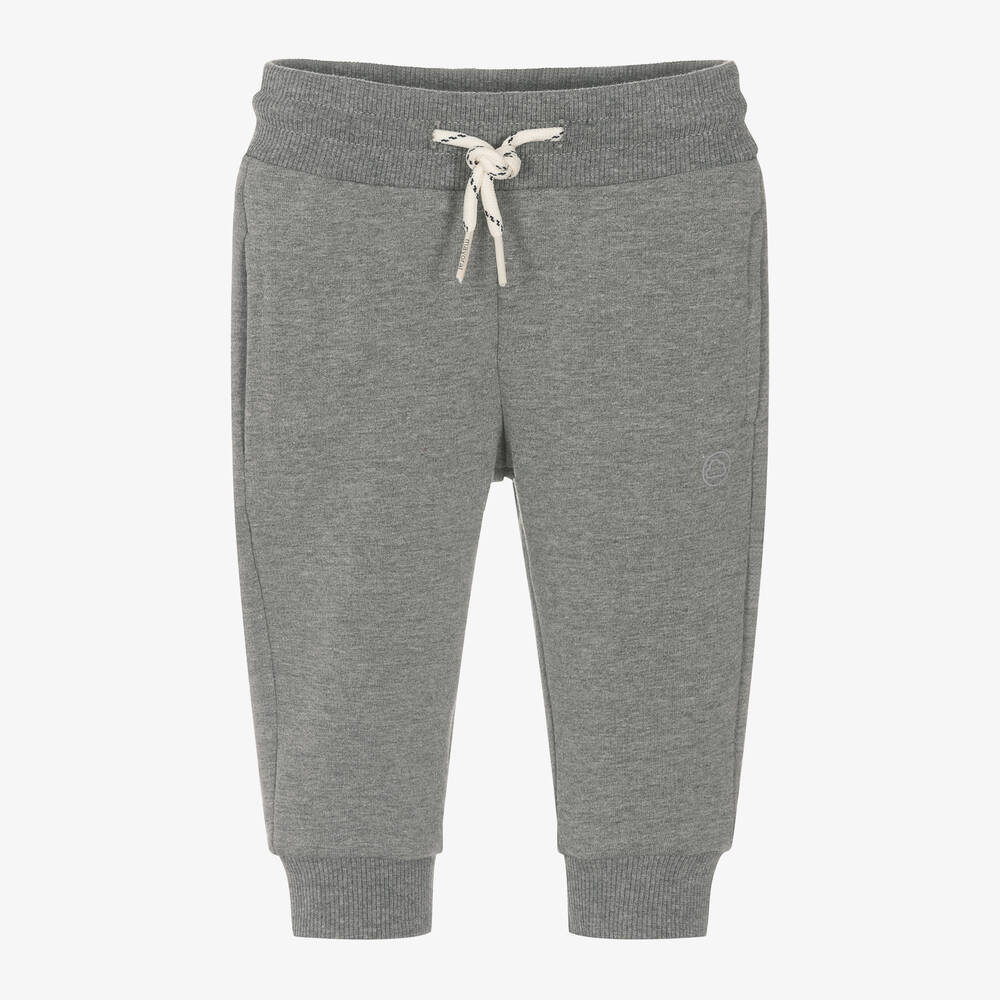 Grey joggers for little boys by Mayoral, made in cotton-blend jersey with a warm, fleecy inside. Cosy and comfortable, these casual joggers have extra durable knees for longer-lasting wear. There are side seam pockets, a drawstring waist and a tonal rubberised logo on the front.