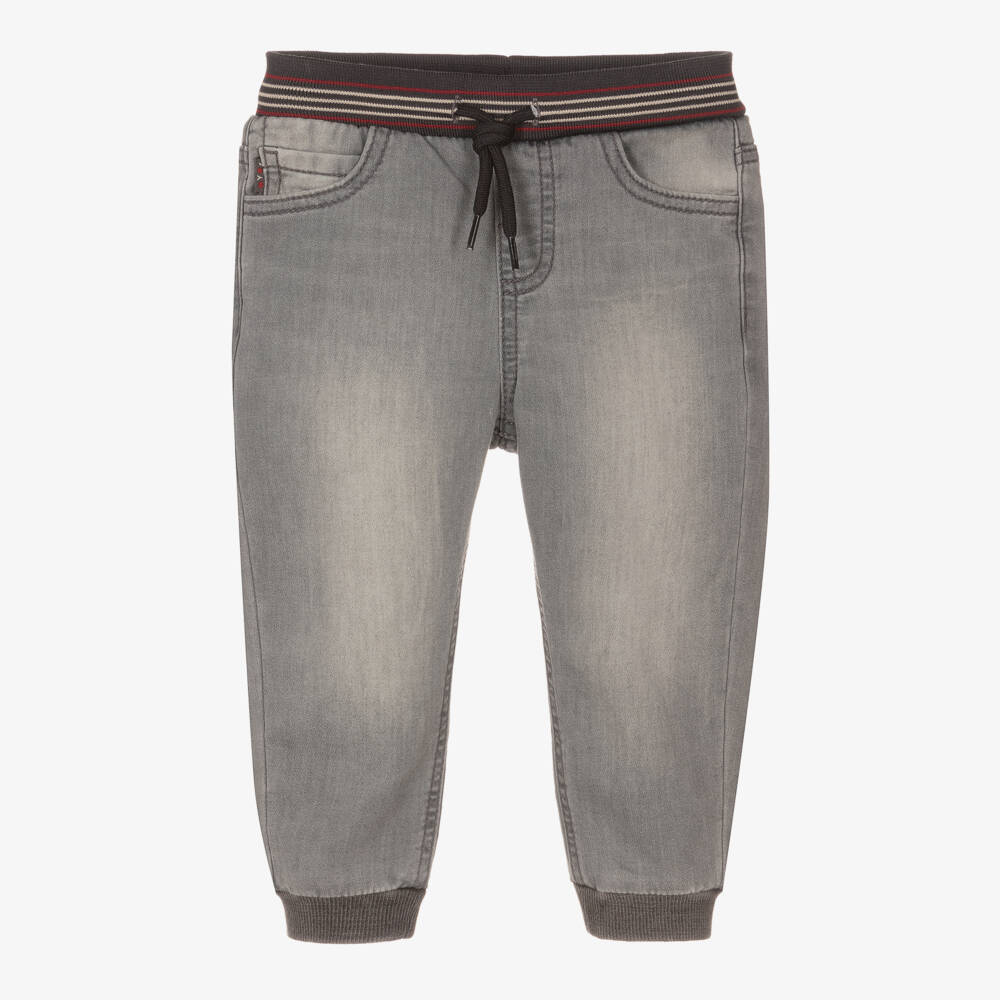 Grey jeans for little boys by Spanish brand Mayoral, with five-pocket styling and a washed and worn look. Ideal for all-day wear, they are made in stretchy, sustainable cotton with the look of denim but the feel of jersey. They have a comfortable jogger fit, with an elasticated navy blue waistband, striped in red and white, a drawstring waist and elasticated cuffs.