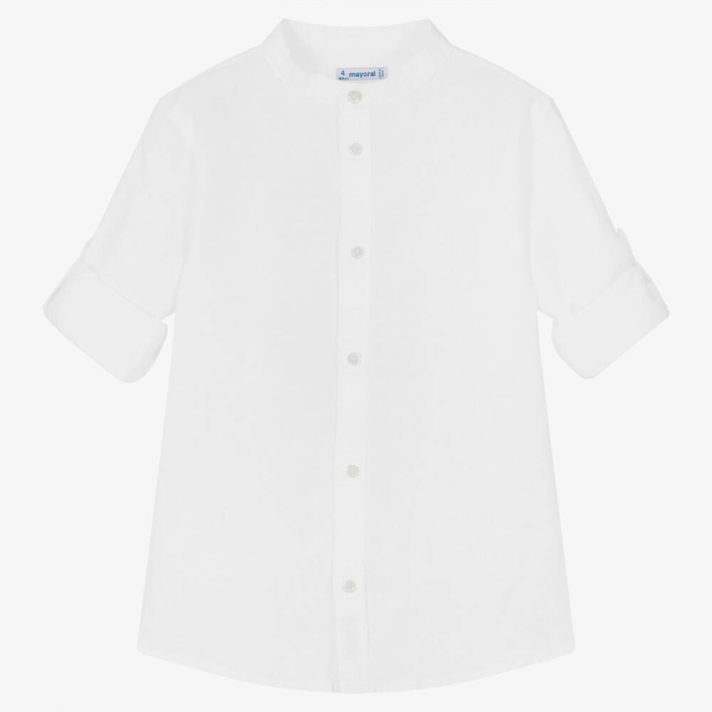 Ivory shirt for boys by Mayoral, woven in a soft cotton and linen blend. In a stylish collarless design, it will be a great addition to his smart-casual wardrobe. There are branded buttons down the front, with button tabs on the sleeves to secure them when turned up. The brand's logo name is embroidered on the button placket for a subtle designer finish.