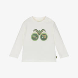 Ivory with red stripes, this casual Breton-style top for boys is by Mayoral. It is made in comfortable cotton jersey, with button tabs on the sleeves to keep them in place when rolled-up. There is a small chest pocket that has the words 'feel your best' embroidered above in black. There are contrasting red striped cotton tabs on the corners of the side seams.