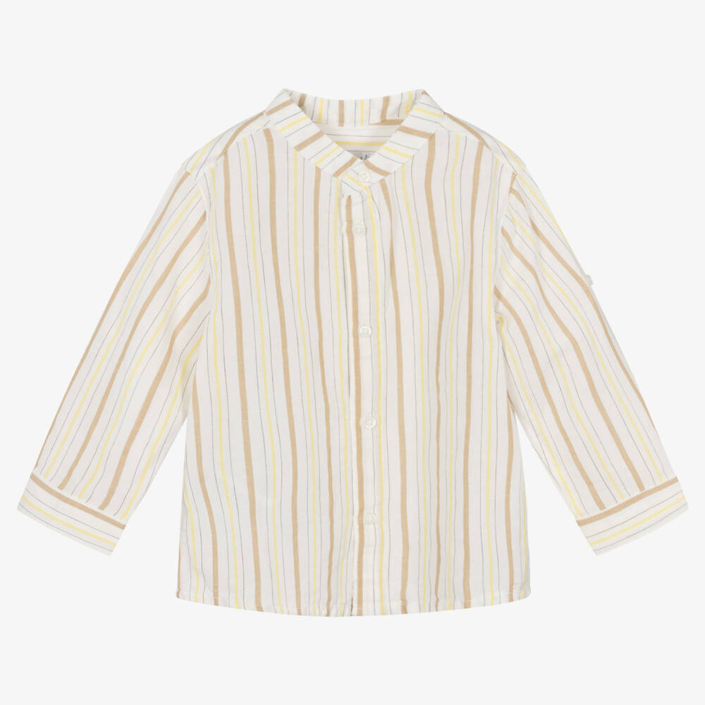 Casual ivory shirt for little boys by Spanish brand Mayoral, made in a comfortable lightweight cotton and linen blend. Collarless, it is striped in beige, yellow and black and has tabs on the sleeves to roll up and secure the cuffs. It fastens with branded white buttons on the front and sleeves.