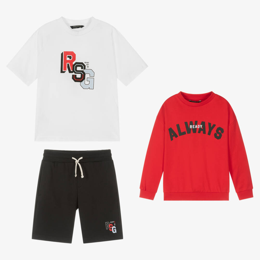 Comfortable three-piece shorts set for boys by Mayoral Nukutavake, made in soft cotton jersey. With a relaxed fit, the set comprises a white T-shirt with raglan sleeves, a lightweight red sweatshirt, and navy blue shorts with concealed side pockets and a drawstring waistband. All three pieces are printed with 'Ready Set Go' and 'Always Ready' in blue, white and red.