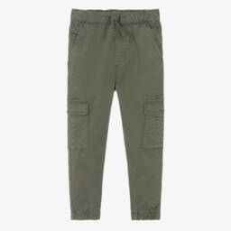 A cosy and comfortable trouser set for boys by Mayoral. The red puffer gilet is warmly padded and has a secure zip fastening. The beige top has blue and red stripes across the front, with a small slogan print. It pairs with navy blue joggers that have an elasticated drawstring waist. Both the gilet and trousers have useful side seam pockets.
