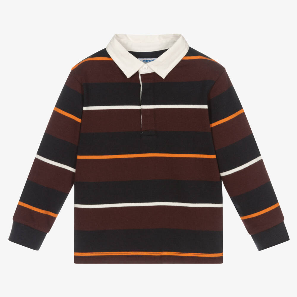 In burgundy red, blue, white and orange, this striped rugby shirt for boys is by Mayoral. Made in soft, comfortable cotton jersey, it has a woven collar and ribbed cuffs. There are front button fastenings, with side vents for ease of movement.