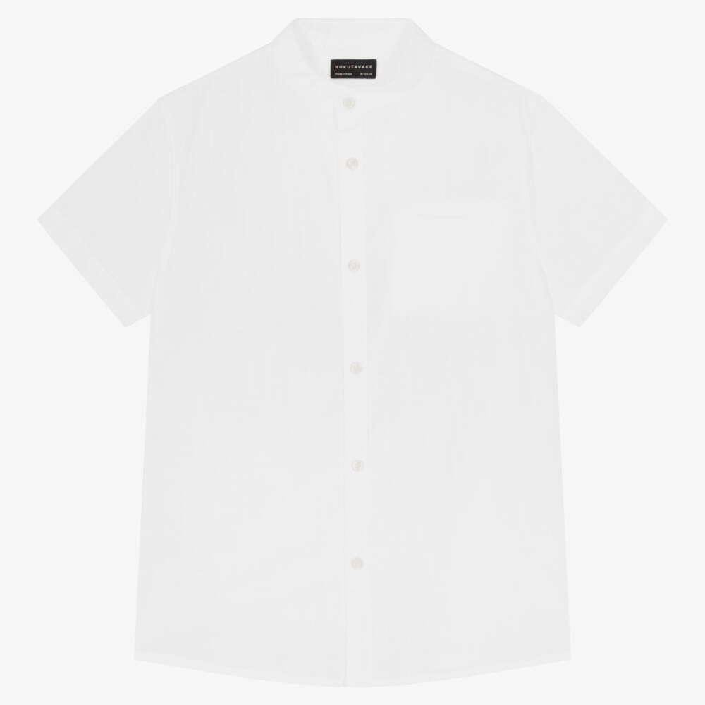 Boys white short sleeve shirt from Mayoral Nukutavake, made in soft sustainable cotton slub poplin. Fastening with buttons, this collarless style has a front slip pocket.