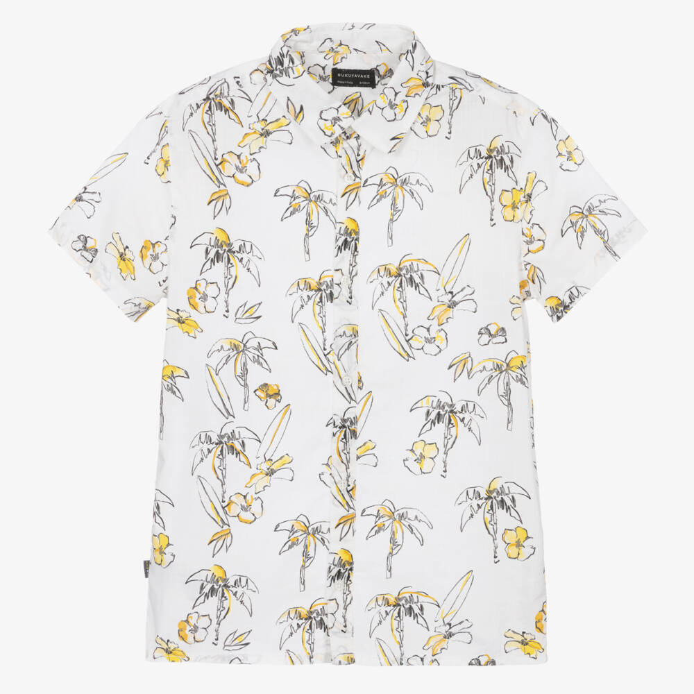 Lightweight white shirt for boys by Mayoral Nukutuvake, with a tropical palm tree and flower print in yellow and black. Cool and comfortable for warm days, this short sleeved style is made in breathable cotton with a lovely slub weave.