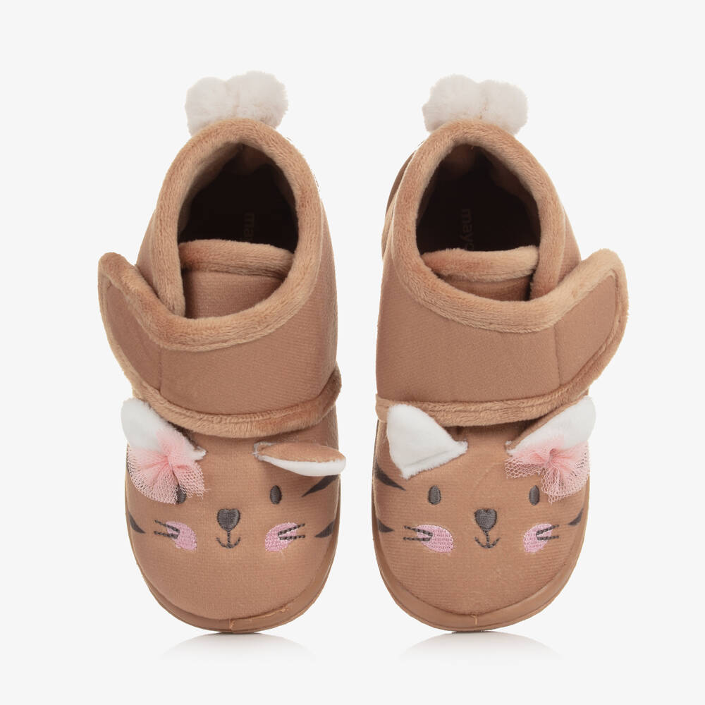 Beige slippers for little girls by Spanish brand Mayoral, with cute bunny rabbit detailing. Cosy and comfortable, these fun slippers are made in soft textile, with a broad velcro strap for easy fastening. There are non-slip rubberised soles for good grip