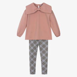 Comfortable and stylish for girls, this beige and navy blue leggings set is by Mayoral. Made in soft cotton jersey, the sweatshirt top has a cosy fleecy inside, with a large collar designed as a statement bow and a keyhole button fastening on the back. It pairs with the tartan check leggings, which have an elasticated waist for easy wear.