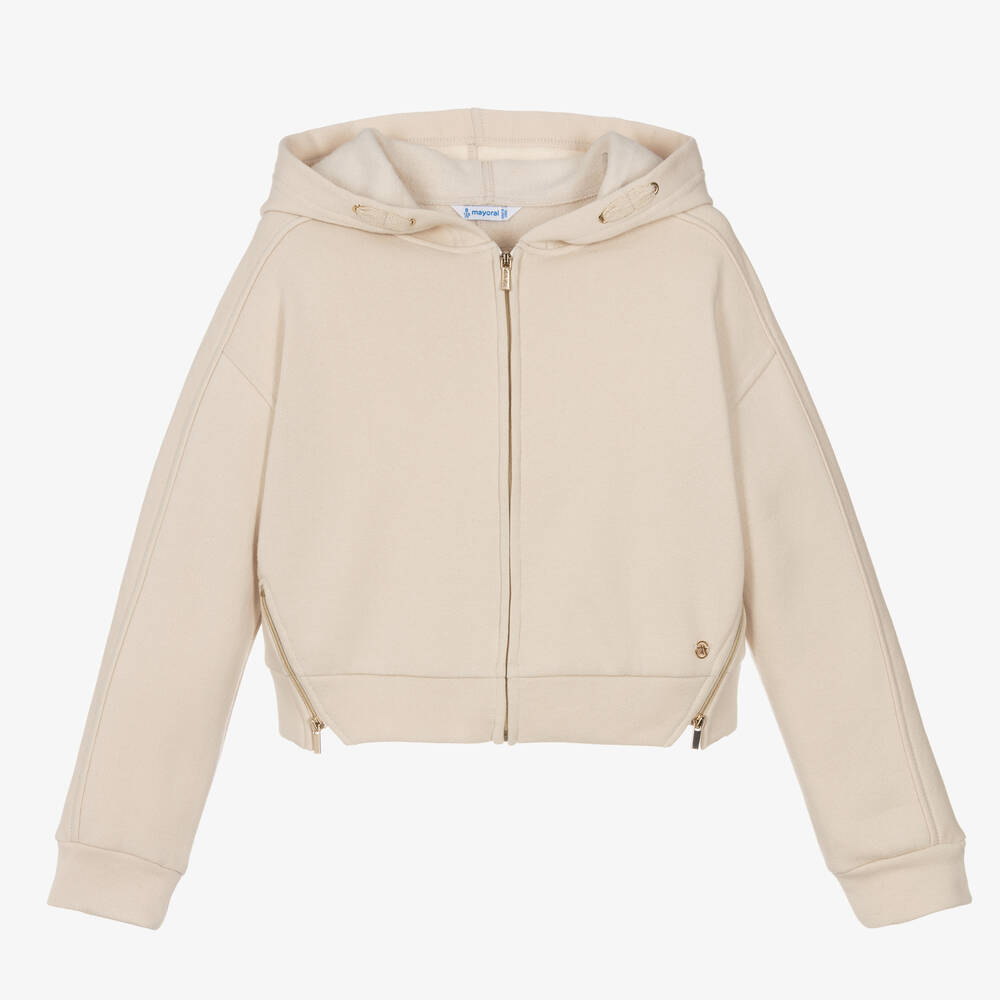 Beige zip-up hooded top for older girls by Mayoral, made in soft cotton-blend jersey with a cosy fleece feel inside. It fastens with a gold-tone zip and branded pull, with matching zips on the front hem. Great for casualwear, it has ribbed trims, decorative detail on the hood and a shiny gold logo charm on the front hem.