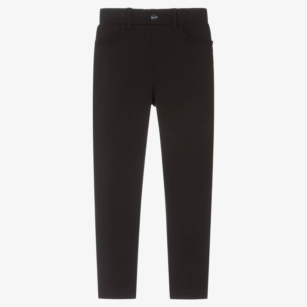 Black trousers for girls from Mayoral, in a super-skinny fit. So comfortable in cotton, they are made in soft, stretchy and medium-weight jersey, with a fleecy-feel underside for added cosiness. They have frill-trimmed faux front pockets, bow details on the back pockets, and a silver faux leather patch on the back. The softly elasticated waist is detailed with a silver-tone faux button on the front and is adjustable for the ideal fit.