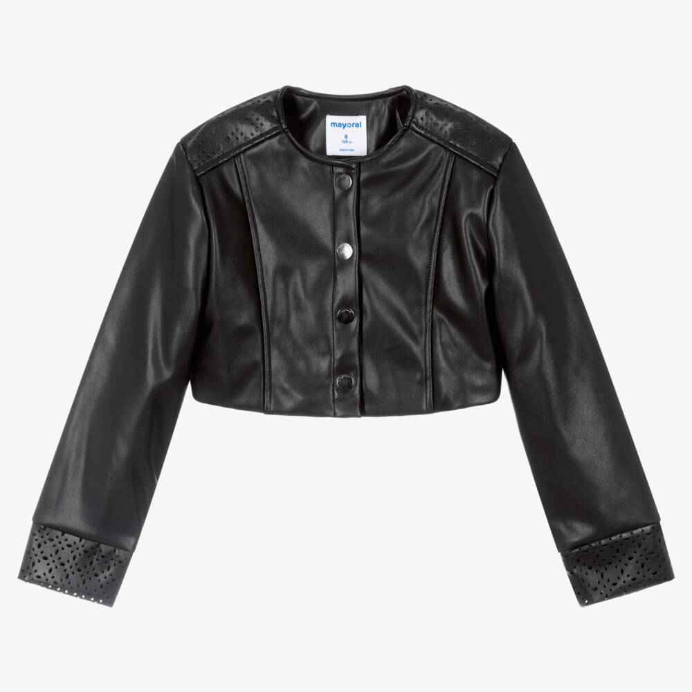 Black faux leather jacket for girls by Mayoral. In a cropped fit, this jacket has cut-out floral detailing on the shoulders and cuffs, creating an edgy feminine look. It is lined in black satin and fastens easily with branded poppers on the front.