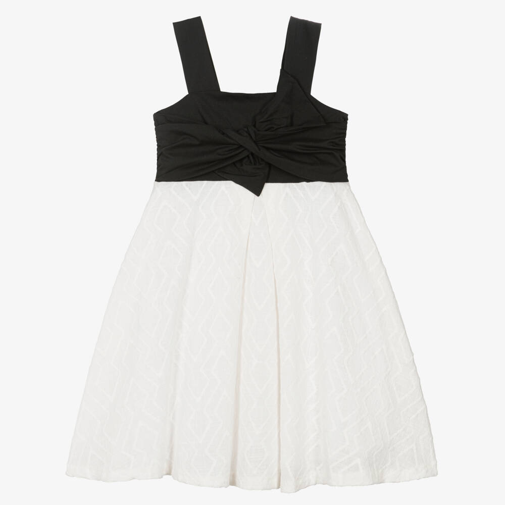 Black and ivory cotton blend dress for girls by Mayoral. A stylish design, the silky smooth bodice has a tie detail across the front and wide shoulder straps. The flared skirt is made in a contrasting softly woven linen-feel fabric with an embroidered zigzag pattern. The dress is fully lined for comfort and fastens with a concealed zip on the back.