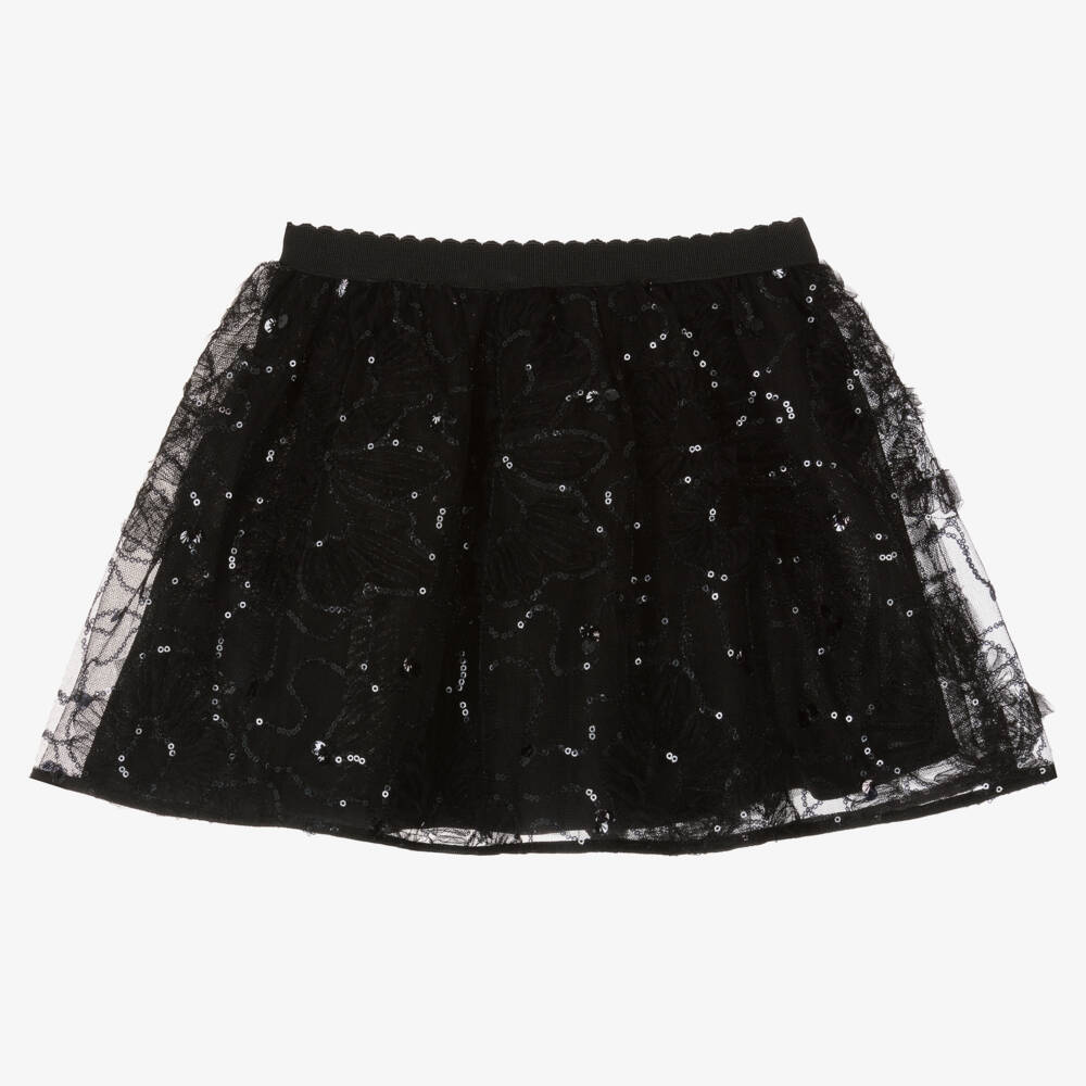 Gorgeous black tulle skirt for girls by Spanish brand Mayoral, with tulle floral appliqués highlighted with shimmering sequins on the older sizes. Made in layers of tulle for volume over a comfortable jersey lining, the stretchy, elasticated waistband is just right for little tummies and has a scalloped trim. Easy to wear, it simply pulls up.