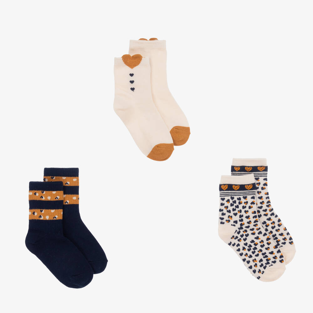 Pack of three pairs of navy blue and beige socks for girls by Spanish brand Mayoral, with touches of tan brown. Made in a soft cotton blend, they have coordinating heart patterns. This item contains organic cotton.
