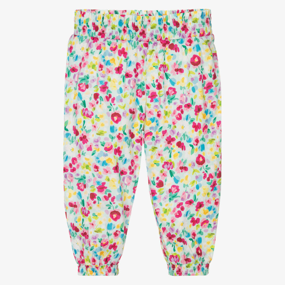 Cute aqua blue trousers for little girls by Mayoral, woven in lightweight cotton. They have a pretty pink, green and blue floral print all-over, with the waist and and ankle cuffs gently elasticated for comfort.