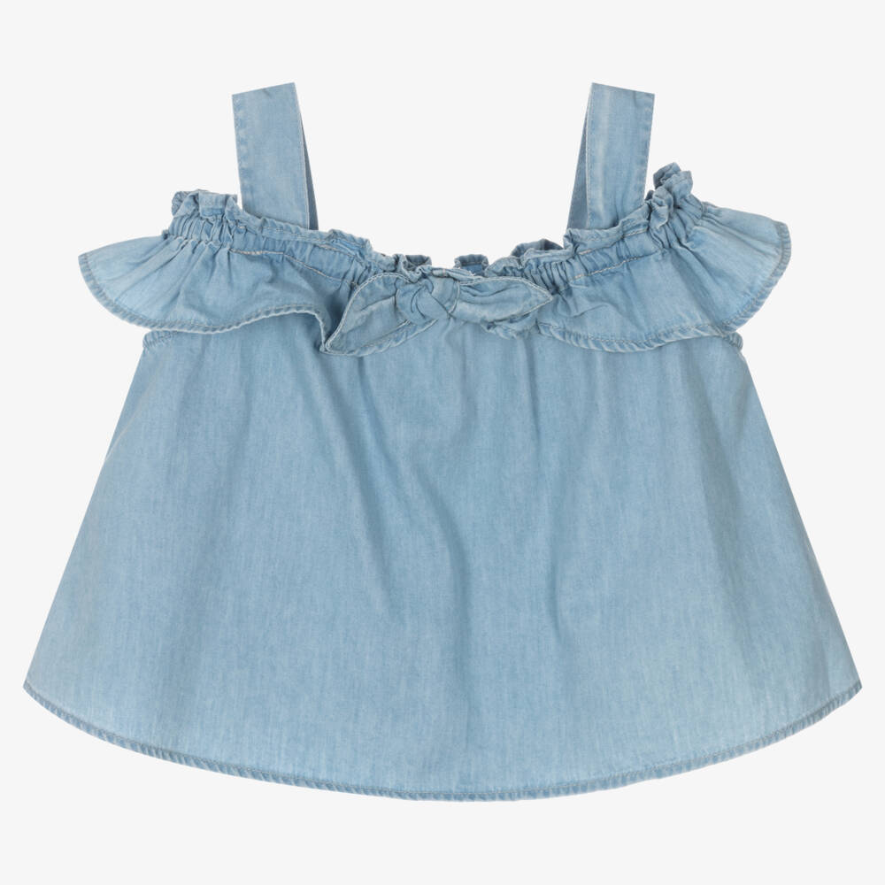 Blue blouse for girls by Spanish brand Mayoral, made in a soft, breathable cotton chambray. The stretchy elasticated neckline creates a comfortable, off-the-shoulder style, while the bow appliqué gives this top a girly feel.