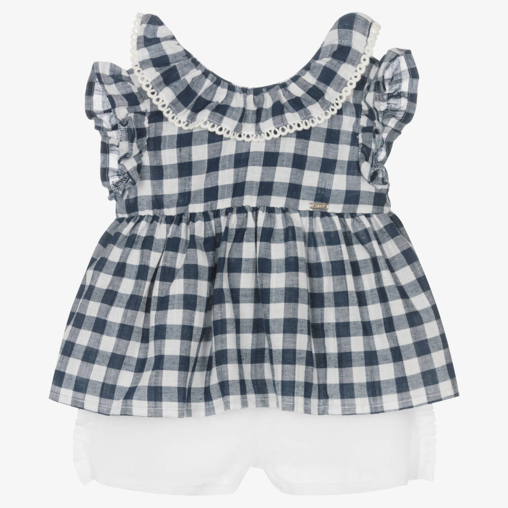A navy blue and white shorts set for girls by Mayoral, made in a lightweight linen blend. The gingham blouse has a ruffled collar, trimmed with cotton eyelets for a pretty touch. It has frill sleeves, a gathered waist, and a fixed bow on the back. The set includes a pair of white shorts with ruffle trims and an adjustable waistband for a great fit.